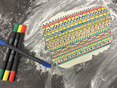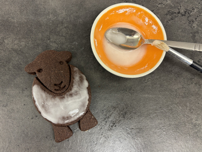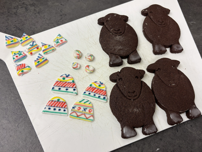 Roll out small rectangles of icing and place them on Herdy’s tummy: this will be the name-label area.